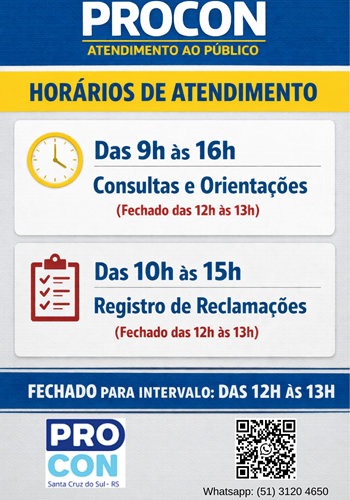 Orientações, denúncias e registro de reclamações podem ser realizados presencialmente, ou pelo WhatsApp número (51) 3120-4650.